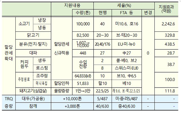 이에 국민 생활과 밀접한 품목 중 7개 품목에는 할당관세 확대를 적용하고, 가공용 대두 1만톤과 참깨 3000톤에 대해 저율관세활당(TRQ) 물량도 확대한다.