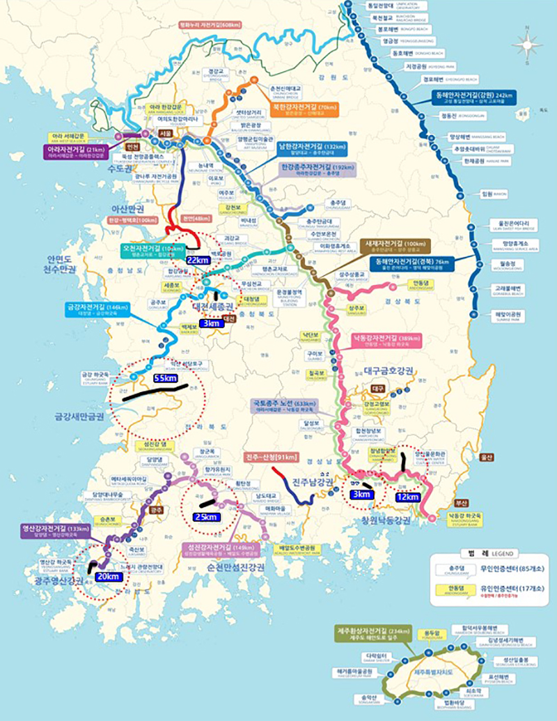 이어 나머지 48km는 오는 2024년까지 지자체 자전거도로 조성을 완료할 계획인데, 이렇게 되면 우리나라 국토종주 자전거길은 총 2237km가 된다.