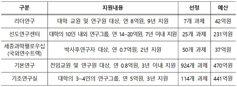 한편 과기정통부는 리더연구와 선도연구센터 외에도 올해 신설해 국가전략기술 분야 우수한 박사후연구자의 국외연수를 지원하는 세종과학펠로우십 국외연수트랙의 50개 과제를 지원한다.