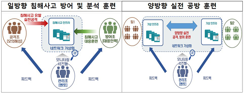 ‘양방향 실전 공방 훈련 과정’은 가상의 기업환경에 접속해 각 팀별로 할당된 인프라에 대한 방어와 동시에 상대 인프라를 공격하는 절차와 방법을 훈련하면서 실질적인 침투사고에 대응할 수 있는 능력을 배양한다.