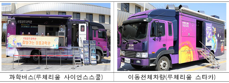 또한 이동 과학관에서는 중력·무게변화 체험 등 과학전시 및 과학공연 프로그램을 제공하는 과학버스와 망원경·태양관측카드 등 천체장비를 활용한 천문관측 프로그램을 제공하는 이동 천체차량을 운영한다.