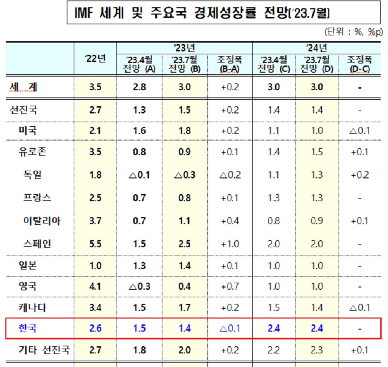 26일 기획재정부에 따르면 IMF는 25일(현지시간) 발표한 7월 세계경제전망에서 올해 한국의 경제성장률 전망치를 4월 발표 당시 1.5%에서 1.4%로 떨어뜨렸다. 이는 정부·한국은행(1.4%), 경제협력개발기구)1.5%) 등 국내외 주요기관 전망치와 유사한 수준이다.