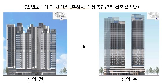 중랑구 상봉동 88번지 일원에 건립되는 '상봉7구역'은 동네 경관을 모두 막고 있었던 43층 5개 동으로 계획된 기존 설계안을 49층 4개 동 타워형 공동주택 841세대(분양 719세대․공공 122세대)로 변경토록 유도했다.
