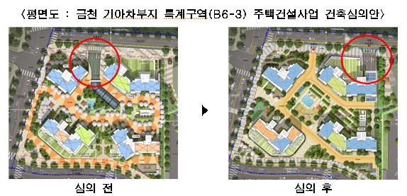 시는 특히 이번 건축심의에서 도시 경관을 고려한 아파트 층수․높이 조정, 단지 중앙에 배치된 주차장 출입구 이동, 어린이집․실내 놀이터 등 주민편의시설 면적 추가 등을 통해 쾌적하고 편리한 주거환경을 유도했다.