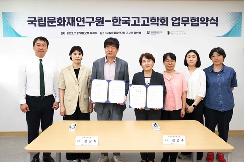 문화재청 국립문화재연구원은 한국고고학회(회장 김길식)와 지난 7월 27일 오후 2시 국립문화재연구원 고고관(대전시 유성구)에서 공동 학술조사연구와 문화유산 전문인력 양성을 위한 업무협약을 체결했다.