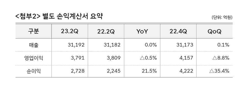 SKT는 별도 재무제표 기준 2023년 2분기 매출 3조 1,192억원, 영업이익 3,791억원, 순이익 2,728억원을 기록했다.