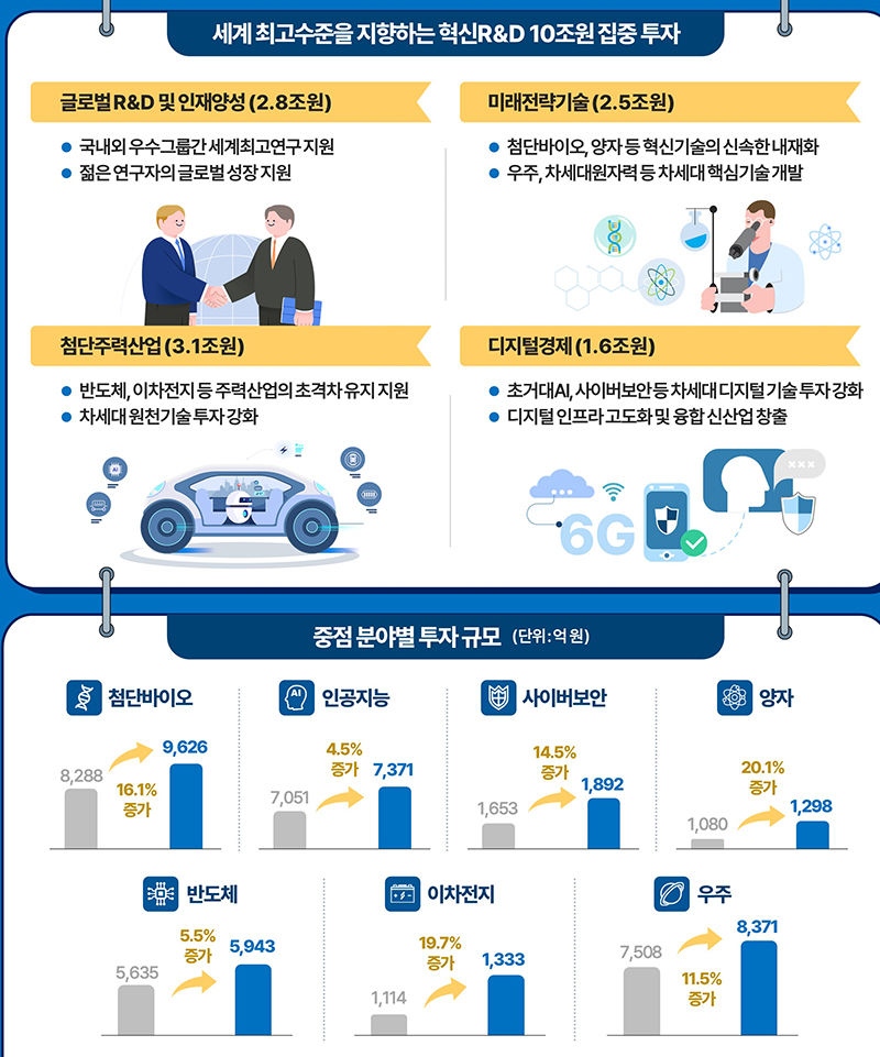 특히, 국가전략기술은 올해보다 6.3% 증가한 5조 원을 투자하는데 첨단바이오(16.1%↑), 인공지능(4.5%↑), 사이버보안(14.5%↑), 양자(20.1%↑), 반도체(5.5%↑), 이차전지(19.7%↑), 우주(11.5%↑) 등 7대 핵심분야에는 투자를 대폭 확대한다.