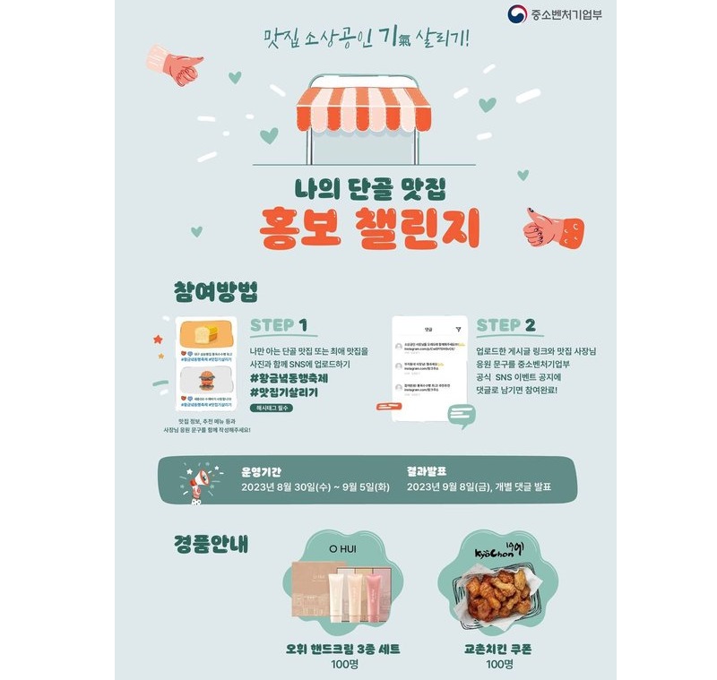 이후 중기부 공식 SNS(페이스북, 인스타그램) 이벤트 공지글에 댓글로 게시물 링크와 맛집 사장님 응원 문구를 남기면, 교촌치킨·음료세트 또는 오휘 핸드크림 세트를 경품으로 받을 수 있다.