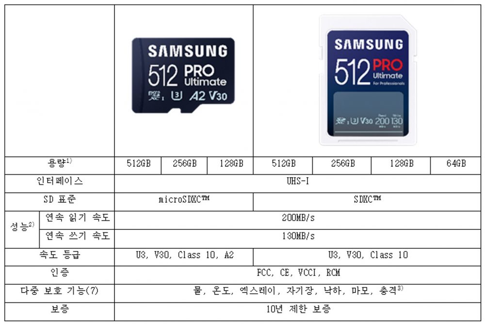 한편 ‘PRO Ultimate’ 마이크로 SD카드는 29일부터 출시되며, SD카드는 오는 10월 출시된다. 각 제품의 용량에 따라 카드 리더기 포함 옵션은 모두 선택 구매할 수 있다. 제품에 대한 자세한 내용은 삼성전자 웹사이트( https://www.samsung.com/sec/memory-storage/memory-card/ )에서 확인 가능하다.