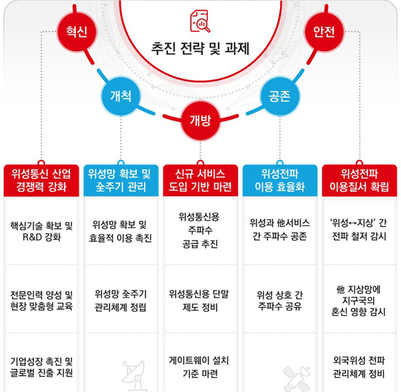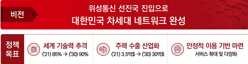 위성통신 분야에 대한 R&D를 지속 강화하고, 국내 독자 저궤도 통신위성 개발·발사와 함께 단말국과 지상국을 포함한 저궤도 위성통신 시스템(시범망)을 구축해 기술 검증을 추진한다.
