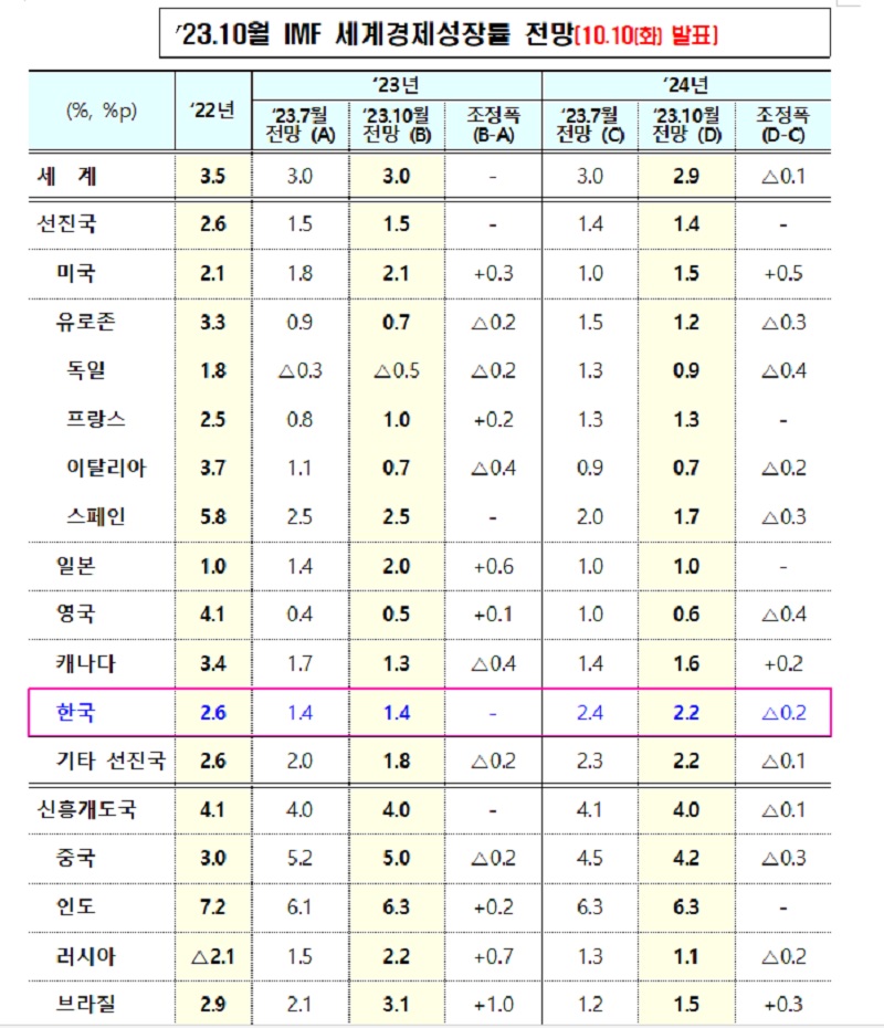 10일 기획재정부에 따르면 IMF는 이날 발표한 10월 세계경제전망을 통해 한국 경제 성장률을 7월 전망치인 1.4%로 유지했다.