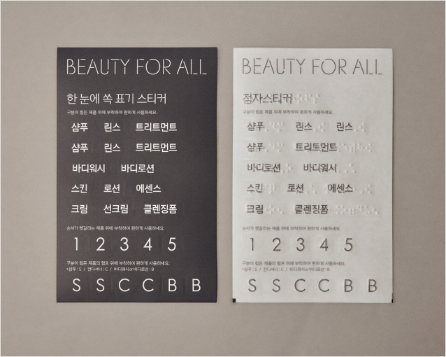 한편 아모레퍼시픽은 유니버설 디자인 자문단을 구성해 내년 출시를 앞둔 신제품에도 사용 편의성과 개선사항을 반영하고, 모두를 포용할 수 있는 아름다움에 대한 접근성(BEAUTY FOR ALL)을 높이는데 힘쓰고 있다. 점자스티커뿐만 아니라 연령, 장애 등의 이유로 저시력을 가진 사용자의 가독성을 높이는 고대비 색상의 ‘한눈에 쏙’ 표기 스티커 또한 제작해 고객에게 제공하고 있다.