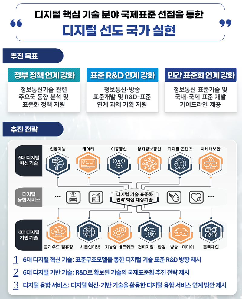 이에 디지털 핵심 기술 분야에서 국제표준을 선점해 디지털 선도 국가를 실현하고자 정부 정책과 표준 R&D, 그리고 민간 표준화 등을 연계 강화할 방침이다.