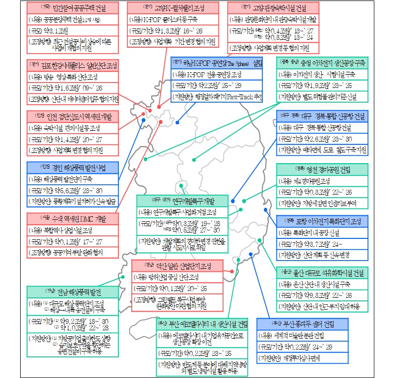 행정절차 패스트 트랙과 관련해서는 ▲하남 K-팝 공연장 ‘더스피어’ 설립 ▲포항 이차전지 특화단지 조성 ▲부산 퐁피두 센터 건립 ▲대구·경북 통합 신공항 건설 ▲경인 해상풍력 발전사업 등 5개 과제가 포함됐다.