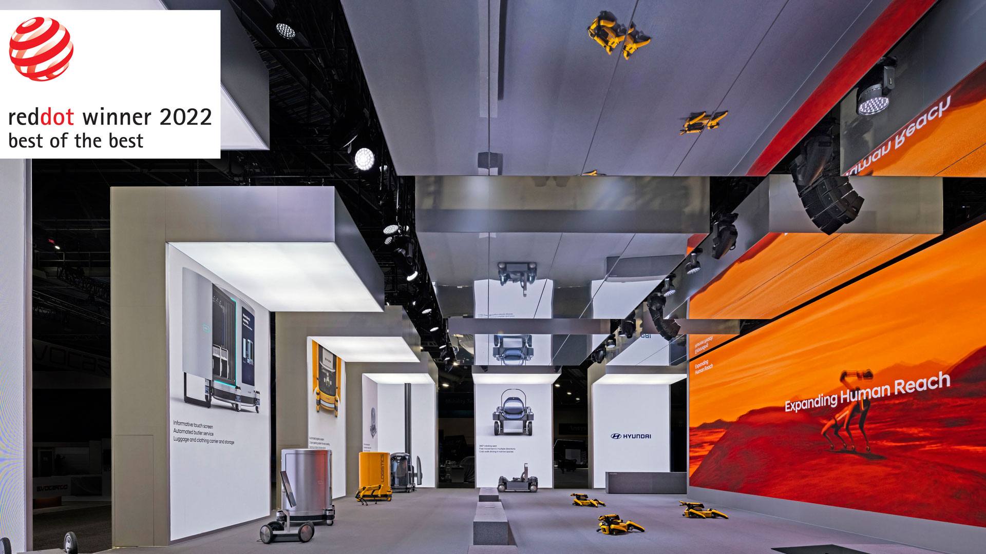 현대자동차가 1월 CES 2022에서 발표했던 ‘이동 경험의 영역을 확장하고 궁극적인 이동의 자유를 실현하겠다’는 로보틱스 비전을 구체화한 ‘CES 2022 현대자동차관’이 ‘전시관(Fair Stands)’ 부문에서, 제네시스 전용 전시관 ‘제네시스 수지’가 ‘브랜드 스토어 (Brand Stores)’ 부문에서 ‘최우수상(Best of Best)’에 이름을 올렸다. ‘최우수상(Best of Best)’은 각 부문별 뛰어난 출품작에 수여된다.