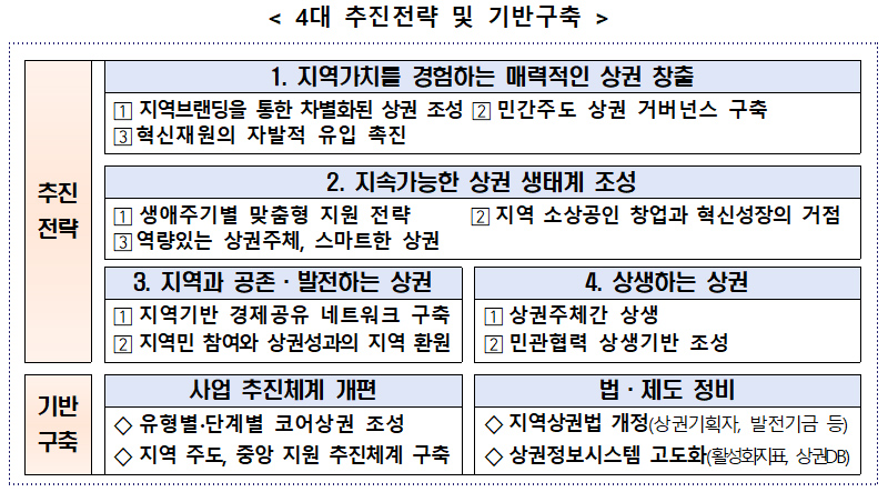 이에 ‘민간주도로 지속가능한 혁신상권을 조성해 지역상권을 재건’한다는 비전을 수립, 이를 위한 목표로 지역의 특성과 매력을 발산하는 지역별 코어 상권 조성, 전략 수립을 위한 예비지역상권 발굴·육성을 제시했다.