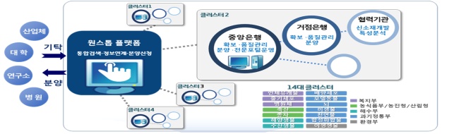 정부는 ‘제3차 국가생명연구자원 관리·활용 기본계획’에 따라 바이오소재의 품질을 향상시켜 유지 관리하고 수요자 접근성을 높여 활용을 촉진하기 위해 부처별로 관리하던 소재자원은행들을 구조조정해 다부처 14대 바이오소재 클러스터를 조성하고 국가전략과 현장 수요를 고려해 육성하고 있다.