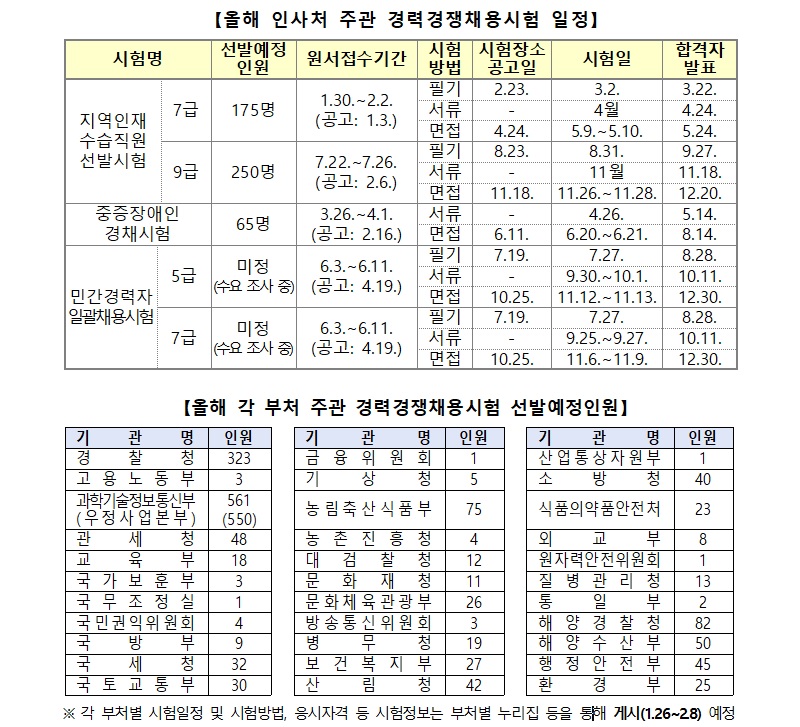 김성연 인사처 인재채용국장은 “수험생들에게 연간 시험 일정 계획을 미리 알려 시험을 준비하는 데 편의성을 좀 더 높였다”고 밝히고 “국민에 헌신하고 열정적으로 일할 우수 인재가 많이 지원하기를 바란다”고 덧붙였다.