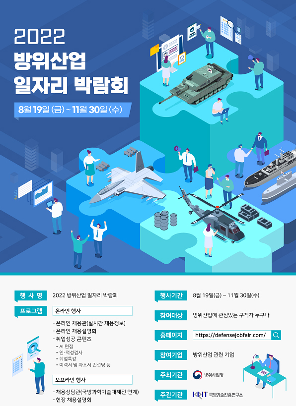 방위사업청은 19일부터 ‘2022 방위산업 일자리 박람회’를 온·오프라인으로 개최한다고 밝혔다.
