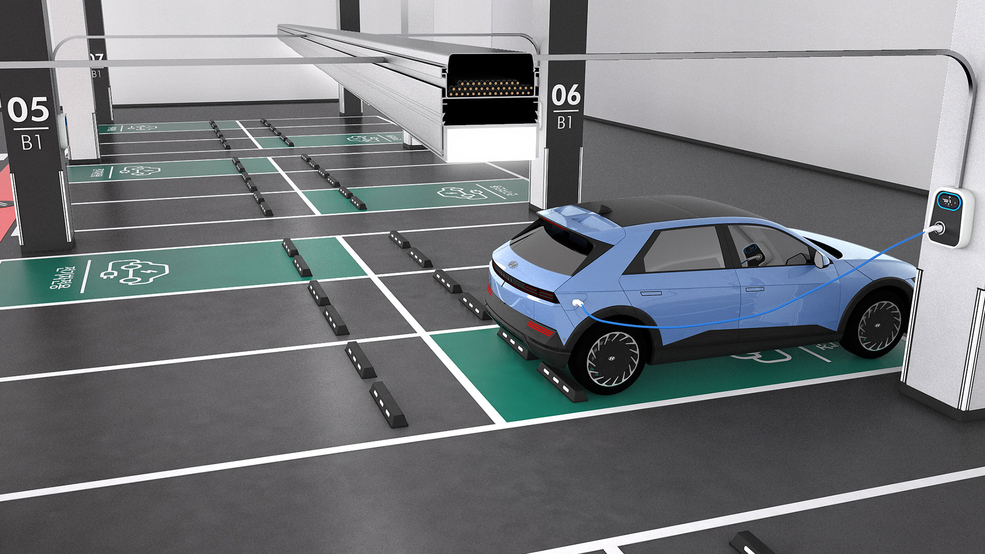 ‘광폭 케이블 덕트’는 주차장 상부의 조명용 덕트를 개선한 설비다. 조명용 전선과 전기차 충전기용 케이블을 함께 설치할 수 있도록 기존 대비 약 2배 확대한 광폭 몰드를 적용한다. 전기차 충전기 설치 시 주차장의 공용 분전반에서 주차면으로 전력 선로를 연결해야하는데, 광폭 케이블 덕트를 활용하면 대규모 추가 설비 공사 없이 원하는 위치에 증설이 가능하다.