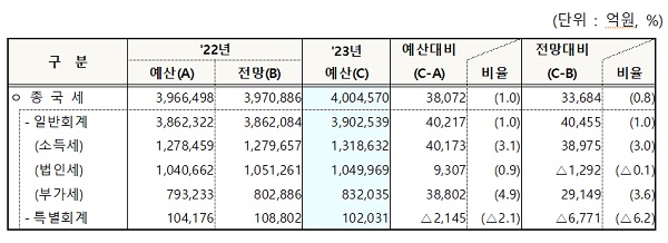 세목별로 보면 금리 상승에 따른 자산시장 둔화로 양도소득세(29조 7197억원)와 증권거래세(4조 9739억원)는 각각 3.3%, 29.6% 감소할 것으로 내다봤다.