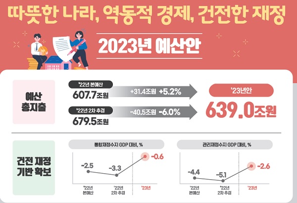 GDP 대비 관리재정수지 적자 비율도 올해 2차 추경 5.1%의 절반 수준인 2.6%로 줄인다. 이는 2018년(0.6%) 이후 5년 만의 최저치다.