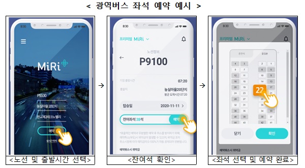 대광위는 모바일 앱 ‘Miri+’를 통해 사전에 좌석을 예약해 정류소에서 정해진 시간에 바로 탑승할 수 있는 ‘광역버스 좌석 예약제’의 확대 방안을 마련하기로 했다. 올해 12월부터 사당역, 강남역 등 출퇴근 시간대 대기인원이 많은 노선부터 단계적으로 확대한다는 계획이다.