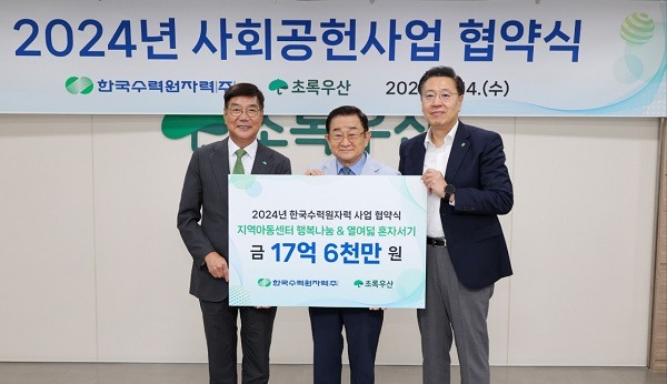 한국수력원자력과 아동복지 대표기관인 초록우산 어린이재단이 지난 14일 서울 초록우산 본부에서 미래세대의 안전하고 건강한 성장을 위해 ‘2024년 사회공헌사업 협약’을 맺었다.
