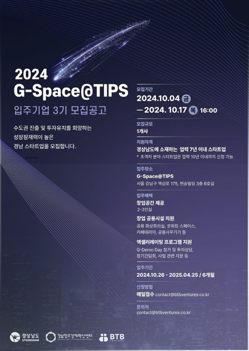 경상남도는 도내 유망 창업기업의 수도권 투자유치를 지원하는 사업인 ‘경남 창업 수도권 거점(G-Space@TIPS)’에 입주할 기업을 17일까지 모집한다고 밝혔다.