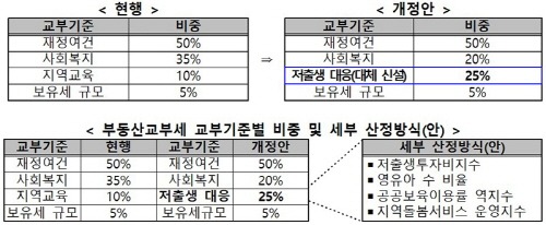 초저출생·고령사회 대응을 확대하고자 합계출산율이 높은 자치단체에 더 많은 교부세를 배분하도록 출산장려 보정수요 반영비율을 2배 늘린다.