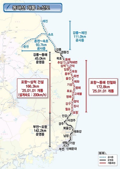 이번에 개통하는 동해선 포항~삼척 구간은 포항역과 삼척역을 잇는 연장 166.3km의 신설 노선으로, 사업비는 3조 4297억 원을 투입했다.