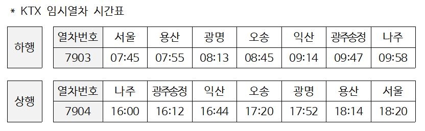 하행 KTX는 서울역에서 오전 7시 45분 출발해 용산, 광명, 오송, 익산, 광주송정을 거쳐 나주역에 도착한다.