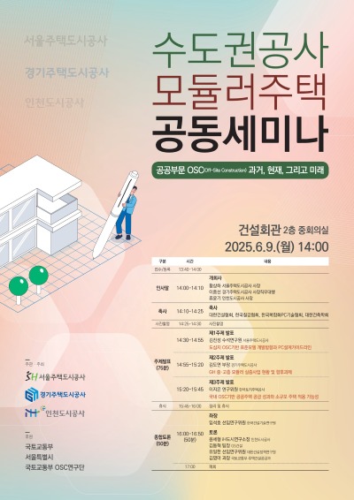 세부 프로그램으로는 △김진성 SH공사 수석연구원의 ‘도심지 OSC기반 표준모델 개발방향과 PC설계가이드라인’, △김도연 GH공사 공공주택기획부장의 ‘GH중·고층 모듈러 실증사업 현황 및 향후 과제’, △이지은 LH 연구위원의 ‘국내 OSC기반 공공주택 공급 성과와 소규모 주택 적용 가능성’ 주제 발표가 예정되어 있다.