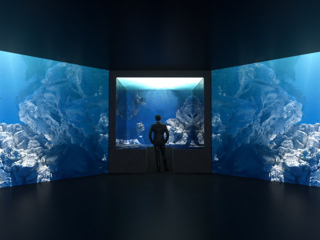 양쪽 벽면이 거울로 이뤄진 통로 너머로 공중에 떠 있는 작품을 마주할 수 있으며, 조명의 역동성과 함께 서로 반사돼 무한한 빛 속에 있는 듯한 경험을 제공한다.