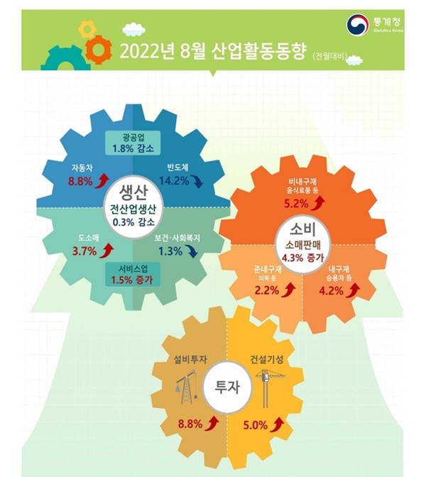 전산업생산은 4월에 줄었다가 5, 6월엔 다시 오름세였으나 7월(-0.3%)에 감소세로 돌아서 8월까지 두 달 연속 감소 흐름을 나타냈다.