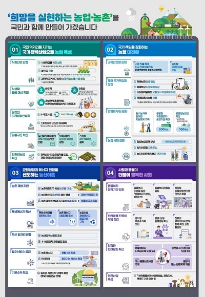 농업·농촌분야 4개 국정과제는 ▲국민 먹거리를 지키는 국가전략산업으로 농업 육성 ▲국가 책임을 강화하는 농정 대전환 ▲균형성장과 에너지 전환을 선도하는 농산어촌 ▲사람과 동물이 더불어 행복한 사회 등이다.