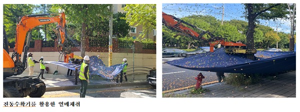 기동반은 가로수 담당 부서 직원 97명으로 구성되며, 진동수확기와 수거망을 활용해 열매를 신속히 수확하고, 낙과 발생 구간은 상시 청소를 진행한다.