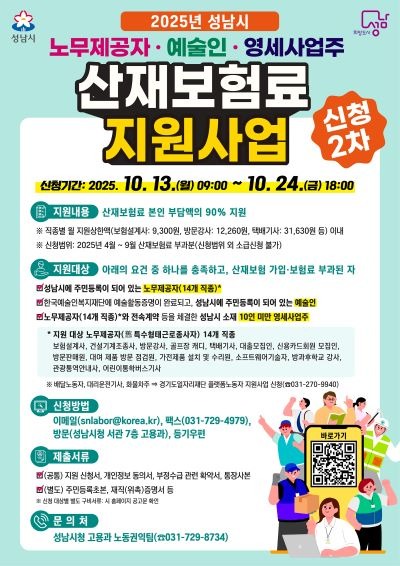 성남시는 오는 10월 13일부터 24일까지 노무제공자와 예술인 등 노동취약계층을 대상으로 산재보험료 지원사업의 하반기 접수를 진행한다.