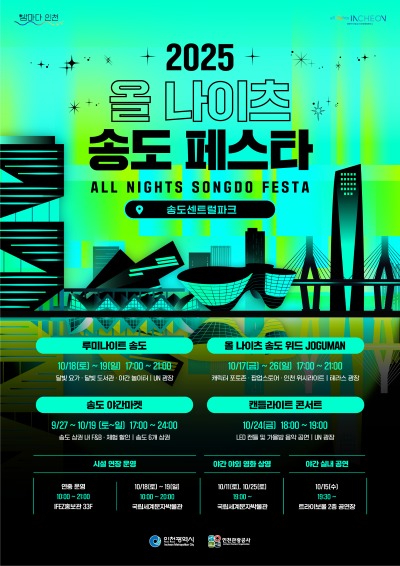 인천시와 인천관광공사는 오는 10월 17일부터 26일까지 송도센트럴파크 일대에서 「2025 올 나이츠 송도 페스타」를 개최한다고 밝혔다. 이번 행사는 대한민국 제1호 야간관광 특화도시 인천을 대표하는 가을 시즌 야간 프로그램으로, 노을과 야경이 아름다운 송도를 배경으로 다채로운 문화‧체험 행사가 펼쳐진다.