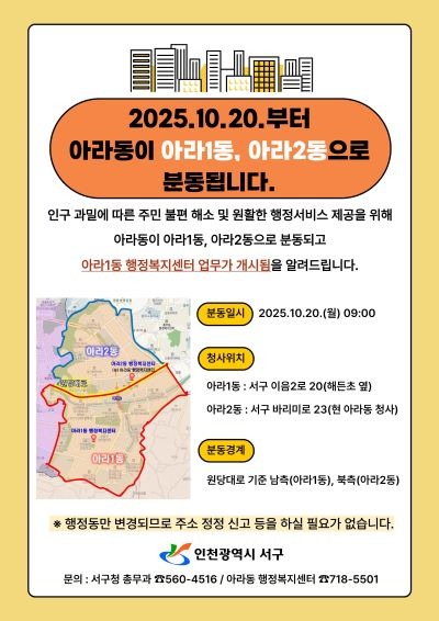 인천 서구(구청장 강범석)는 오는 2025년 10월 20일(월) 기존 아라동을 아라1동과 아라2동으로 분동해 업무를 시작한다고 밝혔다.
