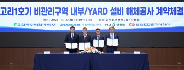 두산에너빌리티는 한국수력원자력(이하 한수원)과 ‘고리 1호기 비관리구역 내부·야드 설비 해체공사’ 계약을 체결했다고 4일 밝혔다. 이날 서울 한수원 방사선보건원에서 열린 계약식에는 한수원 조석진 기술부사장과 두산에너빌리티 원자력BG 김종두 사장 등 관계자들이 참석했다.