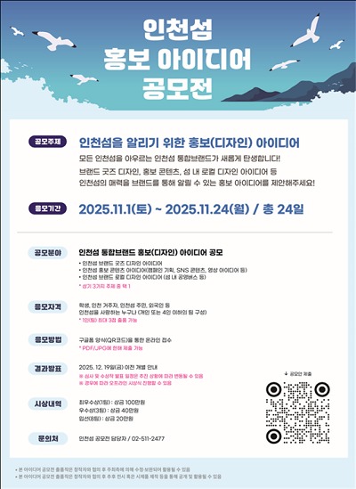 공모 주제는 '인천섬 통합브랜드 홍보(디자인) 아이디어'이며 ▲인천섬 브랜드 굿즈 디자인(인천 섬의 이미지를 활용한 기념품, 상품 디자인 아이디어) ▲인천섬 홍보 콘텐츠(캠페인, SNS 콘텐츠, 영상 등) ▲인천섬 브랜드 로컬 디자인 아이디어(섬 내 공영버스 등 지역 특색을 살린 디자인 아이디어) 세 가지 분야 중 하나를 선택해 응모할 수 있다.