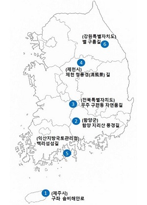 이번에 선정된 관광도로 6곳은 자연경관과 역사문화가 복합적으로 어우러진 제주 구좌 숨비해안로, 경남 함양 지리산 풍경길, 전북 무주 구천동 자연품길, 충북 제천 청풍경길, 전남 백리섬섬길, 강원별 구름길 등 6개 노선이다.