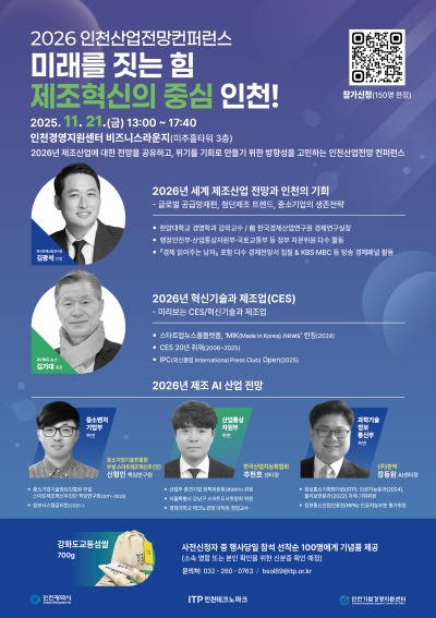 인천테크노파크(인천TP)와 인천광역시는 오는 21일(금) 오후 1시에 송도 미추홀타워 3층 인천기업경영지원센터 비즈니스라운지에서 ‘2026 인천산업전망 컨퍼런스’를 개최한다.