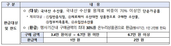 행사 기간 동안 국내산 수산물을 구매한 소비자는 1인당 최대 2만 원 한도로 구매금액의 최대 30%를 온누리상품권으로 환급받을 수 있다.