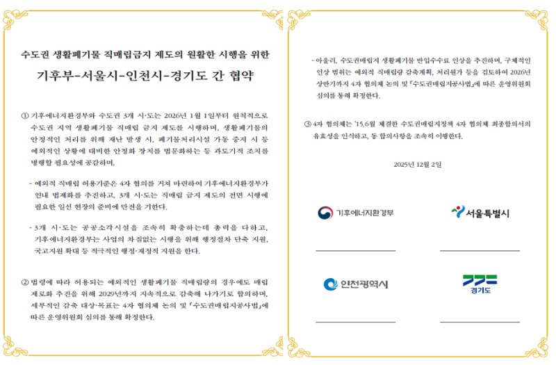 이번 협약은 당초 2015년 4자 간 합의한 대로 수도권의 생활폐기물 직매립금지 제도를 시행하되, 제도 시행 초기 발생할 수 있는 현장의 혼란과 국민 불편을 최소화하기 위한 차원에서 추진됐다.