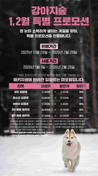 이번 프로모션은 강아지숲을 찾는 방문객들이 보다 합리적인 가격으로 겨울철 강아지숲의 다양한 시설을 이용하며 매력을 만끽할 수 있도록 기획됐다. 사용 기간은 내년 1~2월이다. 프로모션 기간 온라인을 통해 티켓을 구매할 경우 정가 대비 할인된 가격으로 ‘개별 입장권’과 ‘패키지권’을 이용할 수 있다.