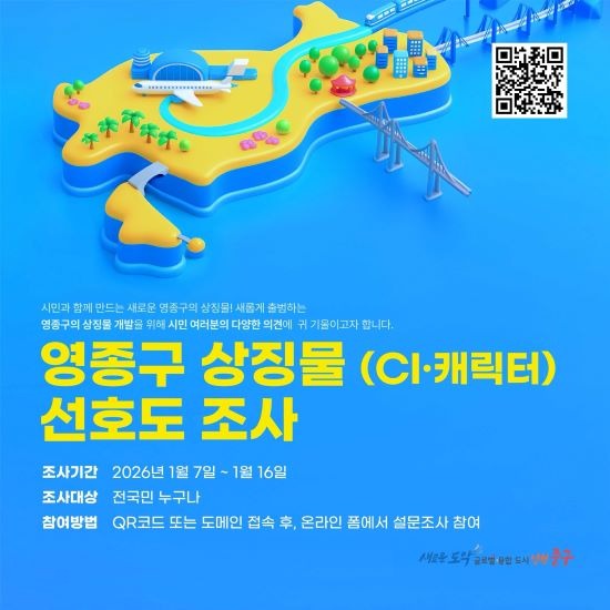 김정헌 구청장은 “주민과 함께 만드는 상징물을 통해 영종구만의 고유한 정체성을 확립하고 경쟁력 있는 도시브랜드를 구축하겠다”며 “구민 여러분의 소중한 의견이 반영될 수 있도록 적극적인 참여를 바란다”고 당부했다.