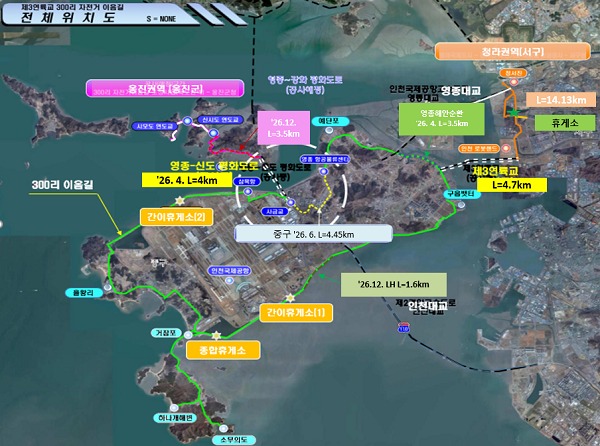 인천시는 청라와 영종을 해안선을 따라 자전거로 일주할 수 있는 ‘300리 자전거 이음길’ 조성 사업이 2026년 완공을 목표로 속도를 내고 있다고 밝혔다.