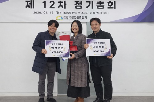 한국공연관광협회는 지난 1월 12일(월) 오후 4시 한국공연관광협회 정기총회에서 ‘2025 한국공연관광대상 시상식’을 개최했다. 이날 시상식에서는 경영부문 진영섭 유유상생 대표, 혁신부문 박문경 피엠씨프러덕션 팀장을 선정해 시상했다.